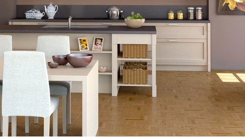 meubles de cuisine facades finition blanc laque, meuble de rangement avec panier en osier, table et chaises blancheMême ambiance déco zen dans cette cuisine travaillée dans une palette de couleurs lumineuses de beiges et de blancs. Avec les tons clairs du parquet, des meubles, des chaises blanches en résine tressée, des paniers pour le rangement, la cuisine se fait douceur et harmonie. Cuisine Schmidt.