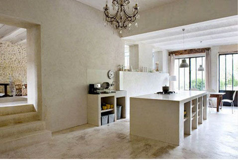 deco cuisine zen couleur lin esprit nature et campagnarde.  ilot central construit en beton recouvert peinture couleur lin, peinture murale assortie