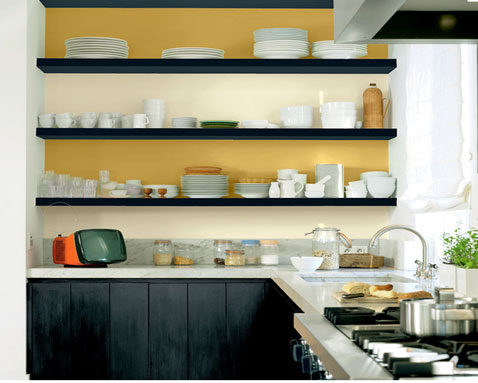repeindre meuble cuisine et etageres avec couleurs contrastees, noir, ocre et jaune Peintures Astral