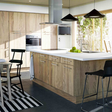 Cuisine avec ilot central en panneaux de particules plaqué chêne, verni acrylique. Plan de travail blancSi la surface de votre cuisine le permet, un ilot central c’est le top pour les moments de partage et pour bénéficier de la vue sur le jardin où que vous soyez. Panneaux de particules plaqué chêne, verni acrylique.  Cuisine Ikea modèle Faktum-Norje Prix de l’implantation type : 659 €