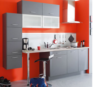 Gris carbone pour les façades de cette petite cuisine joliment rehaussé par le rouge vif de la peinture murale. La crédence en verre sablé forme une unité de matière avec les portes vitrées des meubles hauts. Façades en panneau de particules mélaminé avec chant ABS de même couleur. Modèle Cuisine Liège – Conforama. Prix : 399 € selon plan type.