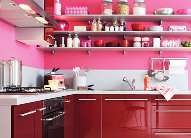 Couleur tonique pour cette cuisine rouge laquée . A noter le mariage réussi des murs rose avec les meubles rouges. Façades en panneaux de particules mélaminés. Cuisine Modèle Spacio – Fly. Prix : 690 € selon plan type