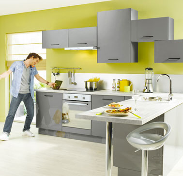 Gris platine, vert olive et blanc pour cette cuisine Conforama aux couleurs vitaminées. Façade en panneau de particules mélaminé laqué gris platine, avec chant ABS brillant de même couleur. Poignées métal finition nickel black. – Cuisine Conforama modèle Tampa gris platine. Prix : 599 € selon plan type.