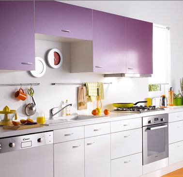 Une couleur pop pour cette cuisine vitaminée. Meubles haut  aux façades dans un joli prune tout doux tout beau à conjuguer avec des meubles bas finition blanc laqué. Existe aussi en finition hêtre.  Façade en panneau de particules. Cuisine Vitamine pop Méribel – Conforama. Prix : 349 € selon plan type.
