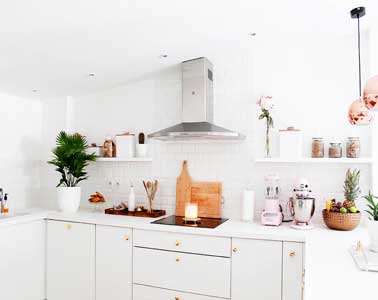 Du cuivre rosé dans une cuisine blanche