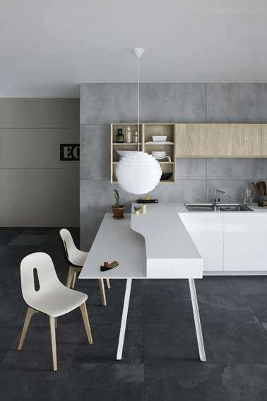 Design à l’italienne pour une cuisine en L ouverte sur le séjour où les meubles sont installés sur une cloison de séparation avec le couloir en mélaminé "Nadir", une jolie finition aspect ciment. Cuisine César.