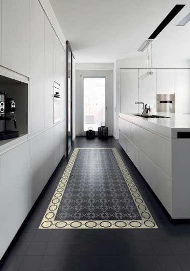 Pour accentuer l’ambiance moderne d’une cuisine blanche, au sol entre les meubles de rangement et l’îlot central, des carreaux de ciment posés en tapis sur un fond noir.