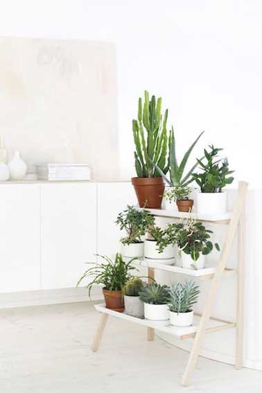 Des plantes en pot posées sur une étagères escabeau, une idée déco à retenir pour apporter de la couleur dans une cuisine blanche sans encombrer le plan de travail.