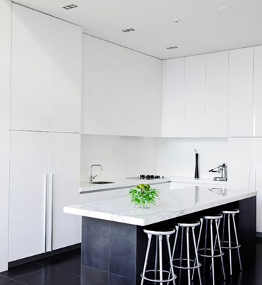Cette cuisine pousse le minimalisme à son paroxysme avec de grands placards blancs et un îlot central anthracite tendance.
