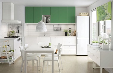 Des meubles vert complétant une cuisine blanche, une combinaison bicolore originale ! Ikea ose les couleurs vives sur ses meubles de cuisine cette saison afin de créer des espaces à la fois pratiques et décoratifs. Mettant en avant un vrai espace repas, cette cuisine Ikea est aménagée avec des meubles sobres aux lignes droites. Et pour gagner de la place l’ensemble de meubles de cuisine est disposé en L dans l’angle de la pièce. Cuisine Ikea Metod finition FLADIE, édition catalogue 2016.