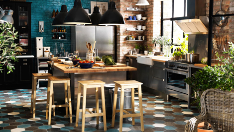 Si vous avez la change de refaire la déco d’une grande cuisine, celle-ci est à craquer tant l’invitation au partage y est présente ! Générosité des matières avec un mur de brique, le bois doré clair de l’îlot central et du plan de travail. Les carreaux du sol reprennent le code couleurs de la cuisine et les touches de noires apportées par les meubles, les superbes suspensions et l’encadrement des fenêtres ont un effet catalyseur. Etagères ino Limhamn dimensions : l 60X p 20 X7 7cm, prix : 12.99 €.