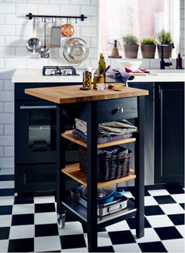 Rien n’est désespéré dans une petite cuisine qui ne dispose pas de suffisamment d’espace pour aménager un îlot central et augmenter la surface de rangement. Une desserte équipée d’étagères fait l’affaire comme dans cette petite cuisine noire joliment mise en valeur par un carrelage sol posé en damier noir et blanc. desserte 2 tablettes réglables en chêne massif avec porte bouteilles Stenstorp 139 €.