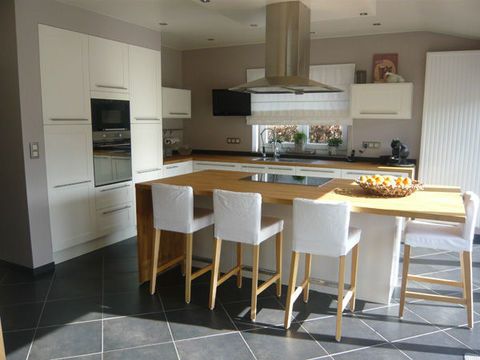 Délimitée par un bar très pratique, cette cuisine ouverte sur le hall d'entrée respire la modernité. Une cuisine blanche lumineuse ne manquant pas de style pour une déco tendance