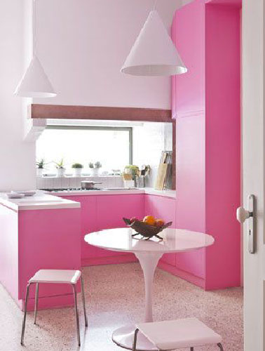 Du rose pour agrandir une petite cuisine ouverte