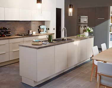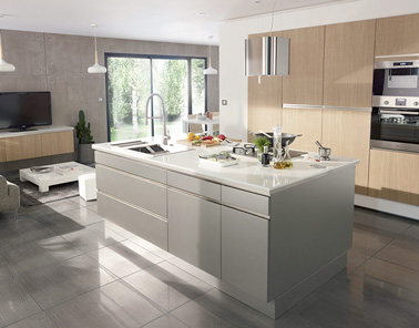Une couleur beige et du gris se combinent dans la déco cette cuisine ouverte aux façades bois. L’îlot central apporte chaleur et convivialité et offre davantage de rangements. Une finition moderne avec une hotte et des luminaires design complètent l’harmonie. Cuisine Leroy Merlin, A partir de 2431.00€