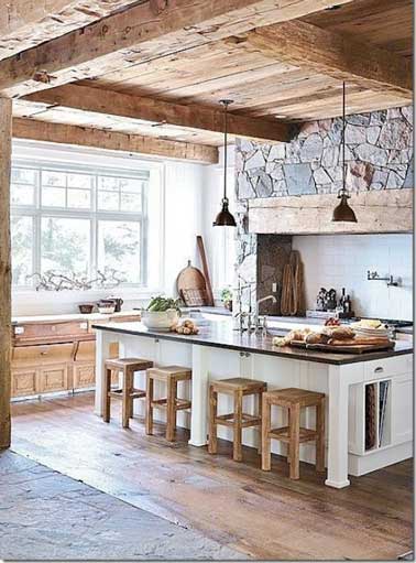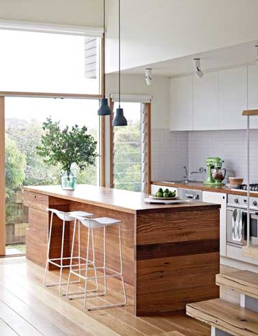 Esprit cabanon chic pour cette cuisine verrière d’une maison provençale. La structure laissée à l’état brut répond au bois brut de l’îlot central et à l’évier en pierre. Les deux suspensions noires et les tabourets de bar modernisent la pièce. Bon plan déco : Les nombreuses fenêtres de la verrière au dessus du travail qui donnent l’impression de cuisiner dans le jardin !