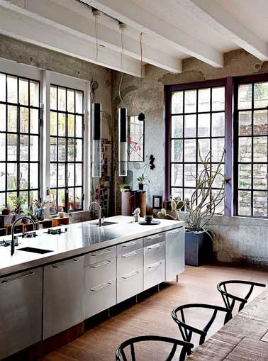 Dans un ancien atelier d’artisan transformé en loft, la cuisine industrielle bénéficie de toute la lumière extérieure avec sa grande verrière de plus de 4m de haut. Ouverte sur une ruelle, elle se compose d’une immense hotte et d’éléments de cuisson inox en opposition avec une table de cuisine et des meubles bas en bois brun. Les chaises dépareillées et le mur en béton peint en blanc, appuient le style marqué de cette cuisine verrière.