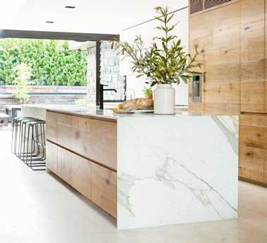 Ultra lumineuse cette cuisine ouverte avec ses meubles en bois et son îlot central en marbre qui ne manquent pas de style ! Ici la grande verrière s’ouvre complètement sur l’extérieur. Le bois brut des meubles hauts et de l’îlot central joue les rappels et crée un équilibre parfait dans la pièce. Le marbre comme revêtement sur le plan de travail et l’îlot central amène à son tour un look design très actuel dans cette cuisine.