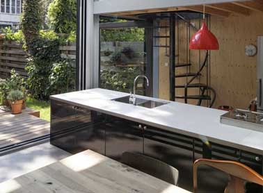 Une belle verrière cuisine à porte coulissante se marie à la déco industrielle de cette grande cuisine. Posée jusqu’au plafond, elle ouvre la cuisine sur le jardin et augmente l’impression d’espace. Réalisée avec une structure aluminium, la verrière s’associe à l’esprit loft de la pièce et se marie au plan de travail blanc et aux meubles laqués noir. La suspension rouge ajoute un ton graphique à la pièce tandis que la table de cuisine en bois et les chaises assorties réchauffent la déco.