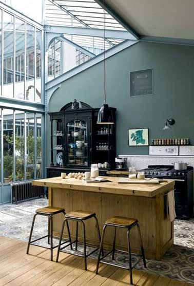 Une verrière toit véranda éclaire la cuisine en bois. Au sol, des carreaux de ciment délimitent l’espace repas du reste de la pièce. L’îlot central et les tabourets bois et acier ajoutent une touche industrielle. Bons élèves, le bahut repeint en noir et la suspension design se plient à l’esprit loft de la cuisine. Bon point : la verrière peinte comme les murs en bleu canard s’intègre complètement à la déco de la cuisine.