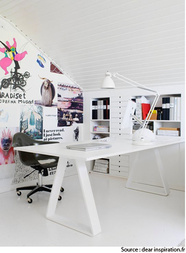 Un aménagement bureau sous combles astucieux avec le rangement de tous les classeurs et documents dans des étagères et casiers construits dans le mur sous la pente pour profiter au maximum de l’espace autour du bureau. Tandis que la peinture blanche offre une belle luminosité à la pièce, le mur derrière le bureau traité dans un style graffiti semble inviter à la rêverie.