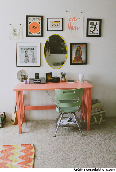 Ambiance chaleureuse et couleurs pastel pour l’aménagement d’un coin bureau dans une chambre autour d’une harmonie de corail et vert de matières confortables et de formes arrondies. Le bureau repeint dans une jolie teinte orangée reprend les couleurs du tapis et est valorisé par la chaise de bureau vintage laissé dans son jus.