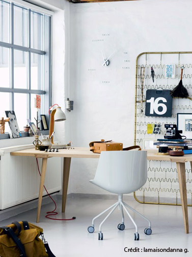Une astuce déco à retenir pour un aménagement de bureau dans un esprit déco récup. Pour le rangement des accessoires de bureau, un sommier métallique à ressorts chiné ou récupéré dans le garage posé tout simplement le long du mur sur lequel sont crochés nos babioles et photos.