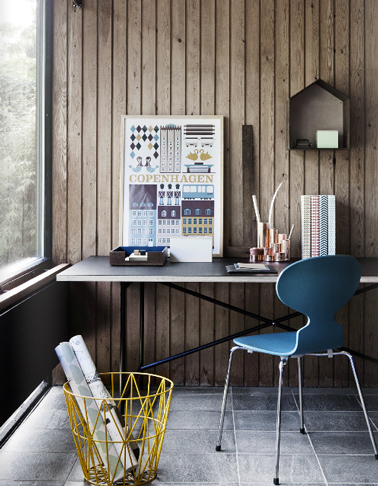 Déco simple mais efficace, cet aménagement bureau mise sur le panorama que lui offre la grande baie vitrée. Le lambris lasuré reprend les couleurs terre de la nature que le bleu de la chaise met en valeur. Dans ce cadre magique le meuble bureau se fait tout simple avec un plateau stratifié noir posé sur un piétement métallique.