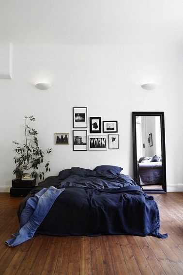 Dans cette chambre le minimalisme règne en maître. Le lit trône fièrement au milieu de la pièce tandis que seulement quelques éléments viennent agrémenter le décor. Sur le mur peint dans un blanc immaculé, seul un miroir posé et quelques cadres viennent créer du contraste et habiller la chambre. La plante amène quant à elle l’esprit nature zen à la pièce de même que les luminaires vasques au mur. Sans artifice, cette chambre adulte propose une déco qui va à l’essentiel, pile dans la tendance. Source : Pinterest.