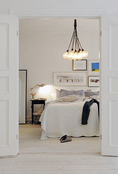 Comme bulle de douceur cocooning, cette chambre blanche au design épuré appelle au repos. La couleur blanc qui prédomine dans toute la pièce lui confère un esprit zen sobre et très tendance. La simplicité épurée de la déco offre d’ailleurs une atmosphère raffinée à la chambre. le lit haut souligne l’élégance du mobilier tandis que les accessoires notamment les luminaires apportent la note de modernité à cette chambre adulte. Une impression de douceur coton qui donne envie de se jeter à corps perdu dans les draps ! Source : Pinterest