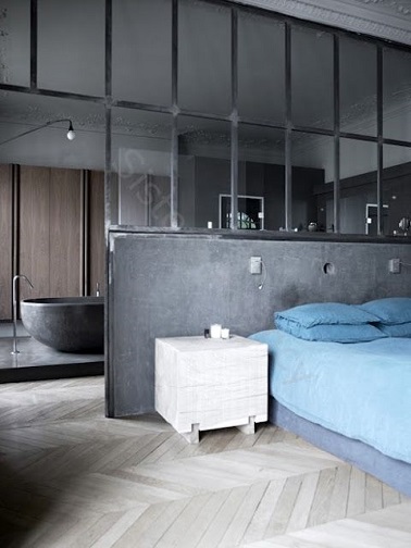 Cette suite parentale à la déco de style industriel baigne dans une ambiance relaxante. La couleur gris qui colore la verrière intérieure sert à la fois de tête de lit et de séparation avec la salle de bain et établit le contraste avec le parquet flottant gris clair. La baignoire design anthracite qui se laisse deviner dans la continuité du lit renforce l’esprit zen et reposant de la pièce. Une chose est sûre; cette chambre a de la suite dans les idées ! Source : itemsbydesignbird.blogspot.pt