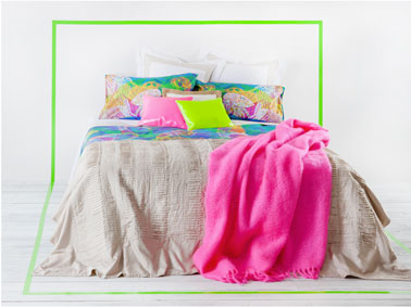 Une chambre adulte associant tons neutres et couleurs flashy pour une harmonie couleurs réussie. A côté de la sereine peinture grise des murs et du parquet repeint, linge de lit, couverture et coussins jouent les troublions avec leurs couleurs flashy. Pour souligner la zone de repos dans la chambre, l’idée tendance de la tête de lit à peindre sur le mur a été retenue et réalisée avec une bande de peinture Vert Anis de Ripolin qui se prolonge sur le parquet repeint en blanc. Housse de couette imprimé animaux. Taille 220X220cm prix :  59.90 €. Couvre-lit en lin, taille 230X250cm prix 199 €. Couverture mohair rose flashy, taille 130X190cm prix 99 € chez Zara Home