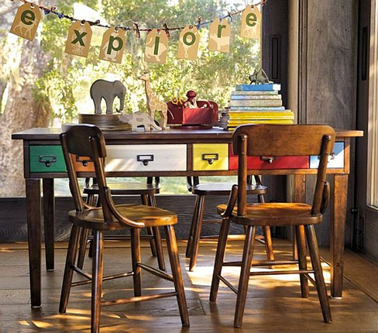 Un bureau dans une chambre d’ado digne d’un bureau de ministre ! Le plateau et les pieds ont été restaurés puis cirés et pour apporter une note jeune et colorée, les six tiroirs sont peints dans une alternance de couleurs primaires et complémentaires. un jaune juxtapose un rouge pour un contraste fort, un vert tendre côtoie un orange chaleureux. Chinées, les chaises en bois ciré invitent aux devoirs !