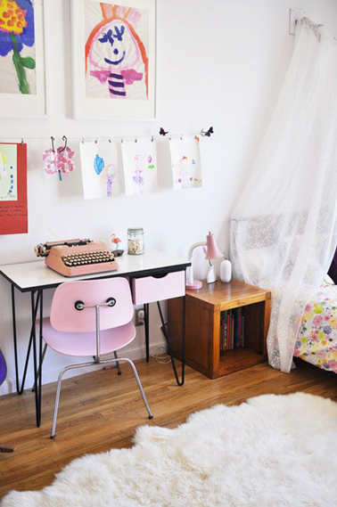 Déco chambre fille. Bureau d'écolier en formica blanc des années 50 assorti à la chaise roseLe bureau d’écolier dans la chambre d’un enfant c’est bien pratique pour classer cahiers, livres et tout son petit bazar et avoir une chambre bien rangée.