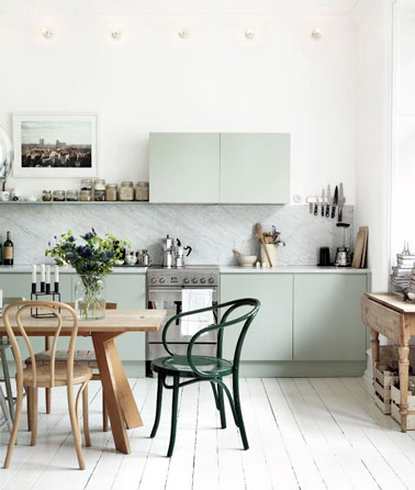 Vous aimez l’originalité ? Mariez votre vieux parquet repeint en blanc avec une crédence cuisine en marbre pour créer un mix de style détonnant dans la cuisine. Liez le tout avec des murs peints eux aussi en blanc, des meubles de cuisine vert d’eau et deux ou trois petits meuble en bois blond et vous obtenez une ambiance de couleurs douces pour une pièce au caractère peu commun. Epicez l’ensemble en optant pour une petit fauteuil de récup repeinteen vert sapin, un four et des ustensiles de cuisine en inox et c’est prêt !