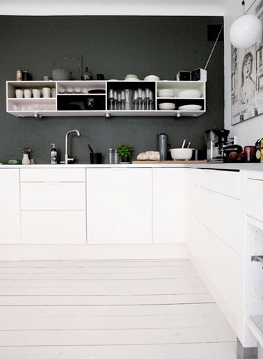 Parquet blanc et mur noir pour déco de cuisine graphique