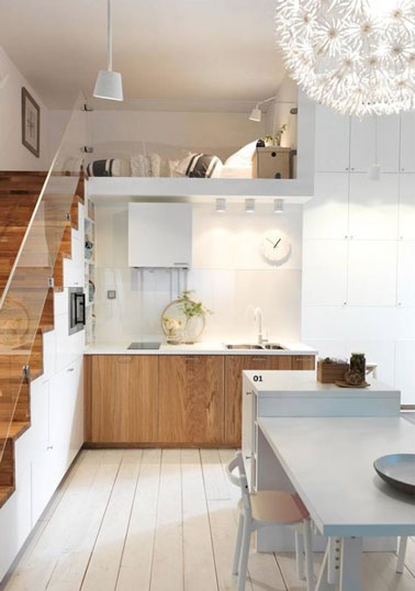 Mix déco parquet blanc et bois dans une cuisine de tiny house