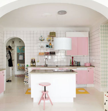 Toutes les filles vont craquer pour cette déco de cuisine rose et blanche ! Parfaite pour l’aménagement d’un studio de jeune fille ou d’une grande dame (pourquoi pas), la cuisine se décline dans cet exemple en rose et blanc. Rose pour le meuble de cuisine haut, les rangements bas et le tabouret de bar. Blanc pour le parquet contrecollé, les murs en carrelage et l’îlot central. Des touches de couleurs jaunes sur le tapis de sol, et vertes pour le papier peint tonifient la déco.