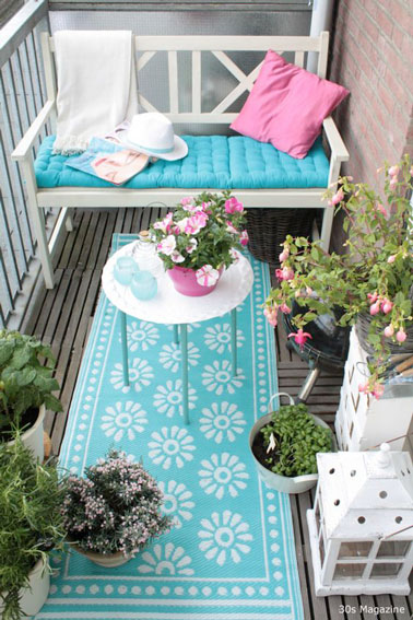 La déco extérieure en rose et bleu turquoise pour un balcon plein de fraîcheur ! Sur un sol en caillebotis bois, un tapis bleu turquoise fait un clin d’oeil au coussin d’assise du petit canapé blanc aménagé au fond du balcon. Des touches de couleur fushia avec le cache pot, les fleurs et un coussin et voilà un balcon ultra pétillant.