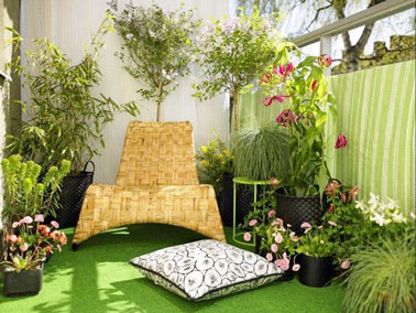Le vert, une couleur qui assure la bonne humeur ! Le gazon artificiel est l’atout de ce balcon joliment aménagé avec des plantes et un beau fauteuil tressé en feuilles de palmier. Un espace cocon protégé du vis à vis grâce un brise vue vert ultra lumineux. De quoi se laisser aller à la bronzette en toute tranquillité et sans pression !