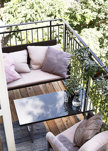 Pleines de douceur, les couleurs pastel apportent calme et sérénité sur ce balcon au sol recouvert de parquet. Aménagé de manière cosy, ce petit balcon saura vous procurer bien-être et détente, les doigts de pieds en éventail tout en profitant de l’air printanier. Une déco de balcon idéale pour les plus retissants aux couleurs vives.