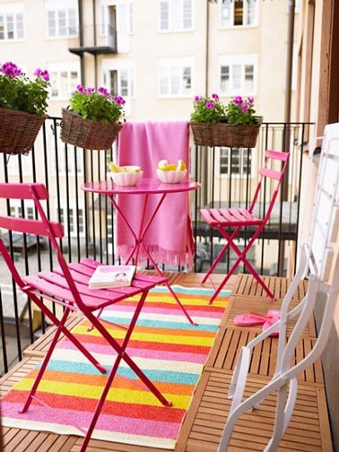 La petite table rose bonbon et ses chaises assorties donnent à ce balcon en ville un air de vacances ! Les fleurs en jardinière et le plaid de couleur rose autour d’un sol en caillebotis forment une association de couleur qui en jette avec le tapis de sol à rayures rose jaune soleil.