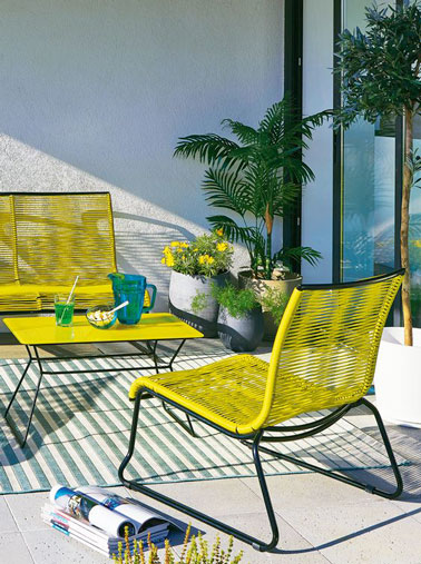 La couleur jaune est une valeur sûre en déco sur un balcon inspirant la joie et le soleil. Voici des jolis fauteuils en fil jaune fluo dans lesquels il sera fort agréable de se relaxer ou prendre le petit-déjeuner à coup sûr !