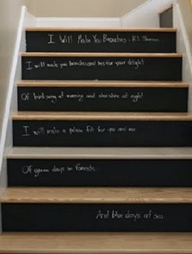 Un escalier déco avec une peinture tableau noir, une bonne idée pour personnaliser ses marches. Sobre et tendance, cette peinture permet de rendre l’escalier moderne tout en le personnalisant en écrivant à la craie sur les contre-marches peintes. Pratique et ludique, cet effet ardoise ravira à coups sûr ceux qui aiment l’originalité discrète.