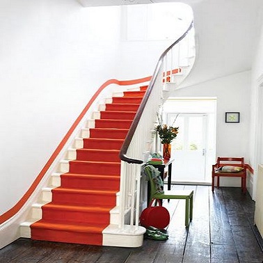 Peindre un escalier peut aussi être l’occasion de créer des effets déco. C’est le cas de cet escalier qui joue sur le contraste de la base blanche et la bande large peinte en rouge orangé pour donner l’impression d’un immense tapis. Et pour appuyer encore plus l’effet, une bande comme une rampe remontant le long des marches est peinte sur le mur dans la même couleur. De quoi donner un genre festival de cannes, montée des marches à votre escalier déco.