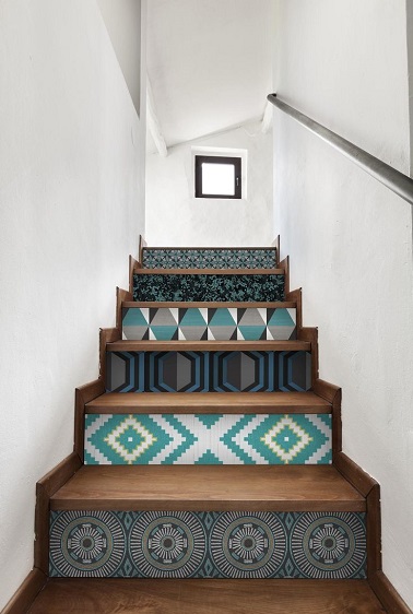 Des morceaux de papiers peints découpés pour décorer les contre-marches d’un escalier trop sage, une idée à piquer pour chez soi ! ©Ugepa