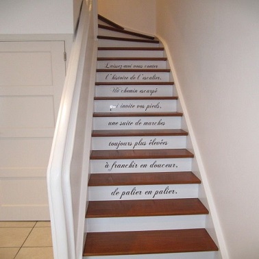 Les stickers aussi s’invitent dans la déco des escaliers ! Donnant une originalité supplémentaire à cet escalier classique blanc et bois, ces phrases calligraphiées sont en réalité de simples stickers. Très facile à poser, cette idée déco vous permettra alors customiser facilement chacune de vos marches à votre guise.