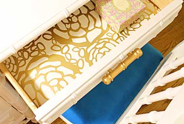Bonne idée pour relooker un meuble un peu trop stricte : tapissez le fond des tiroirs avec des restes de papier peint. Habillez les fonds de tiroirs avec un seul papier peint ou mélangez les styles en collant une chute différente à chaque fois. Pour cette coiffeuse le choix d’un papier peint doré et raffiné s’imposait.