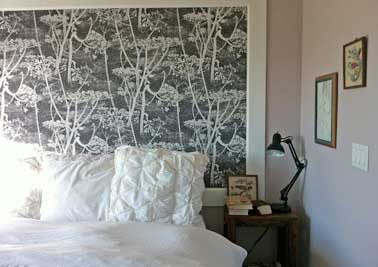 Il vous reste trois grands lés de papier peint ? Profitez-en pour vous offrir une tête de lit originale ! C’est astucieux et toujours très décoratif dans une chambre. Il suffit de coller un cadre de papier peint rectangulaire sur le mur de la tête de lit. Pour cela, tracez les contours au crayon au dessus du lit puis tapissez le mur. Pour la touche déco supplémentaire, encadrez le tout de baguettes bois peintes aux couleurs de la chambre.