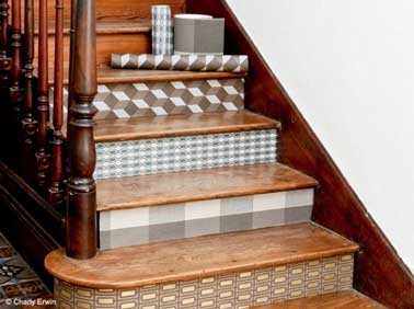 Pour une déco d’escalier rigolote, collez des chutes de papier peint sur les contre-marches. Optez pour des motifs différents en respectant un camaïeux de couleurs assorties et posez une chute de papier peint sur chaque marche. Déco atypique assurée !